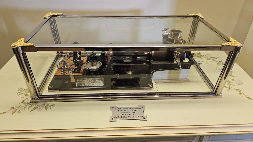 Una de las piezas más singulares es el fonógrafo Edison, deseado por Alfonso XIII en su adolescencia. Inventado en 1877, permitía grabar y reproducir sonido mediante cilindros de cera.